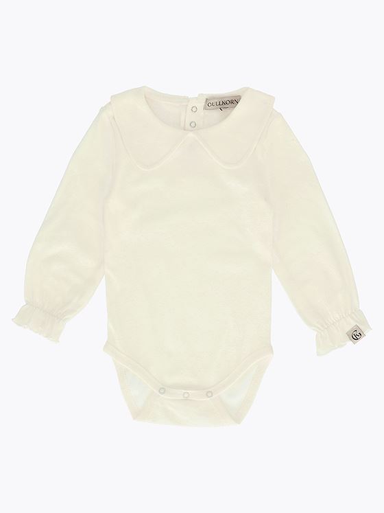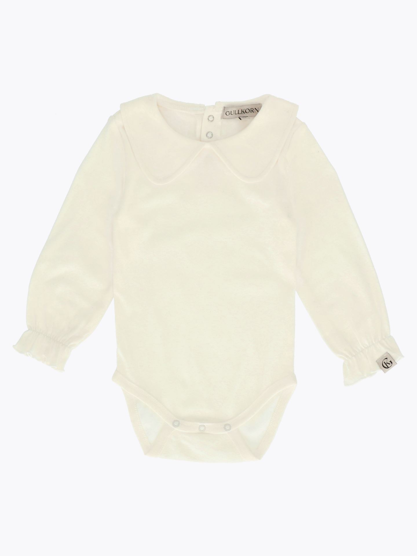 En superfin og myk body til de aller minste, med skjønn krage og detaljer på ermer. Passer perfekt til finere anledninger, eller til hverdagsbruk. Bodyen har trykknapper bak i nakken og bunn. Er enkel å ta av og på, med mye plass til hodet. Bomullskvaliteten er lett, puster godt og har kjempegod stretch, noe som gjør den behagelig til både lek, og i de små pausene. Denne kvaliteten holder seg godt, vask etter vask, og kan gjerne arves mellom venner og søsken!