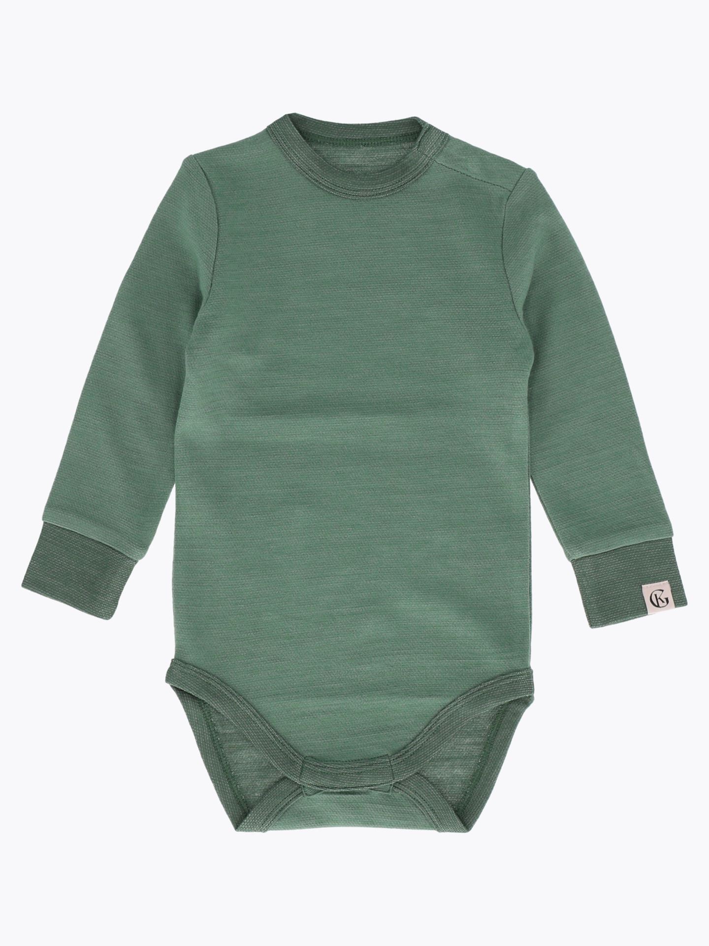 Ullens naturlige isolasjon holder babyen varm, mens viskosen sikrer at bodyen er kløfri og komfortabel hele dagen.Praktiske trykknapper på skuldrene gjør det enkelt å kle av og på babyen, og gir en sømløs påkledning. Denne bodyen er både funksjonell og behagelig, og en utmerket del av babyens garderobe for kalde dager.